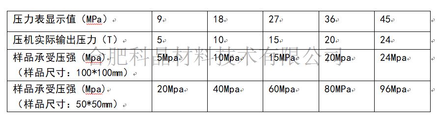 壓力控制系統 | ·手動油壓機 ·油缸直徑:φ79mm; ·油缸行程:25mm; ·最大工作壓力和壓強:24T同時樣品實際承受壓強值≤100Mpa; ·手動加壓,標配機械壓力表顯示壓力,可選配數顯壓力表顯示壓力 ·壓力表顯示值、壓機實際輸出壓力和樣品實際承受壓強對照表如下 ·對照表中壓力表顯示值和壓機實際輸出壓力是實測數據,如果需要其它壓力值,可以參考本公司推算的公式: ·壓機實際輸出壓力(T)=壓力表顯示值(MPa)* 系數 0.55 ·樣品承受壓強請根據不同樣品尺寸,根據壓強=壓力/面積公式進行計算得到; ·在不超過機器最大工作壓力24T的前提下,樣品實際承受壓強值必須≤100 Mpa,否則容易損壞機器的上下壓板。 |
